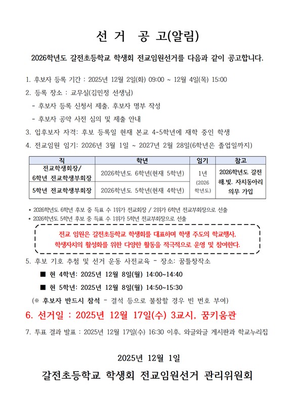 2026. 갈전초 학생회 전교임원선거 공고
